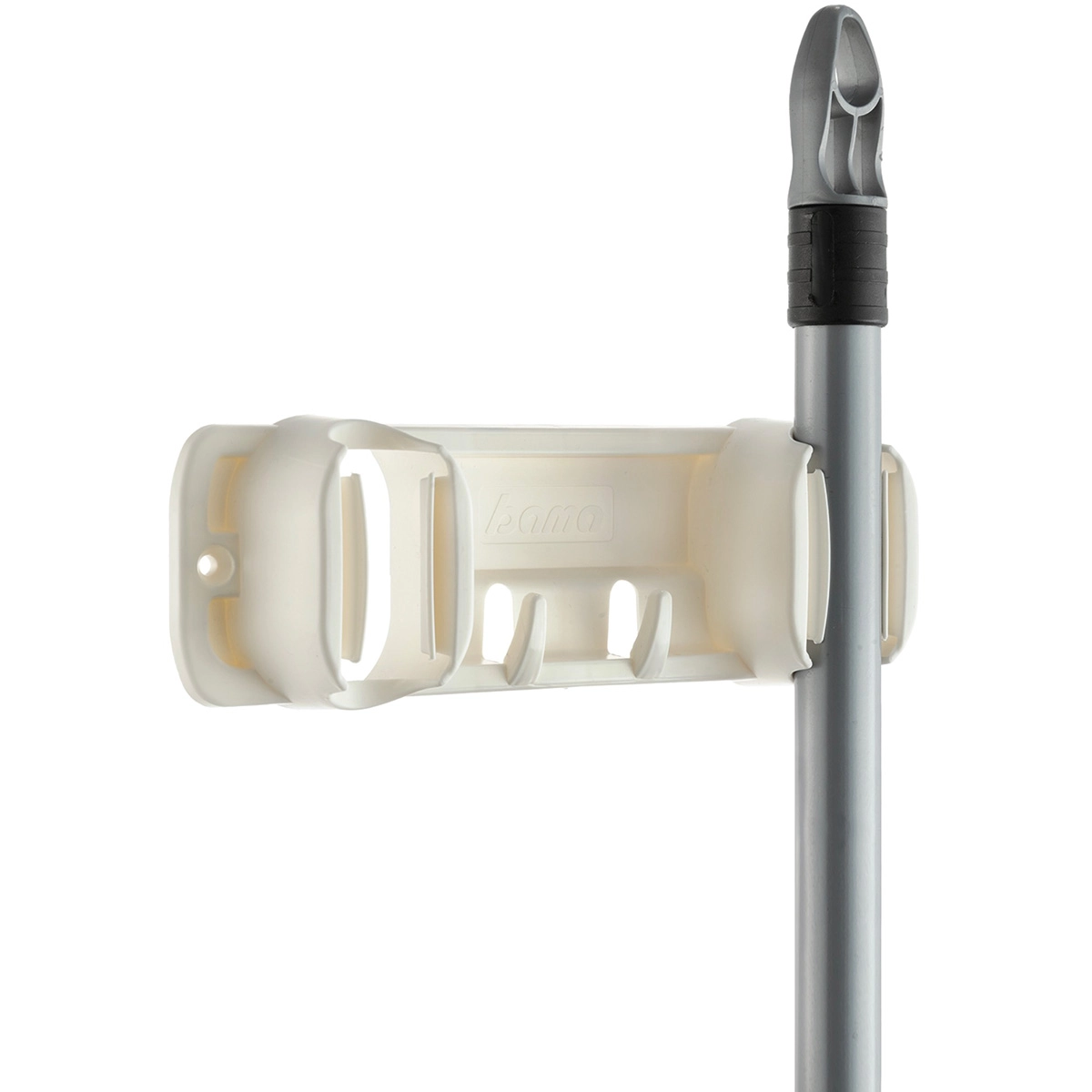 Questo supporto per scope, palette e piccoli accessori per le pulizie offre una tenuta imbattibile grazie alla struttura rinforzata e alla doppia opzione di fissaggio: biadesivo ad alta tenuta (incluso nella confezione) o viti per una solidità extra.
