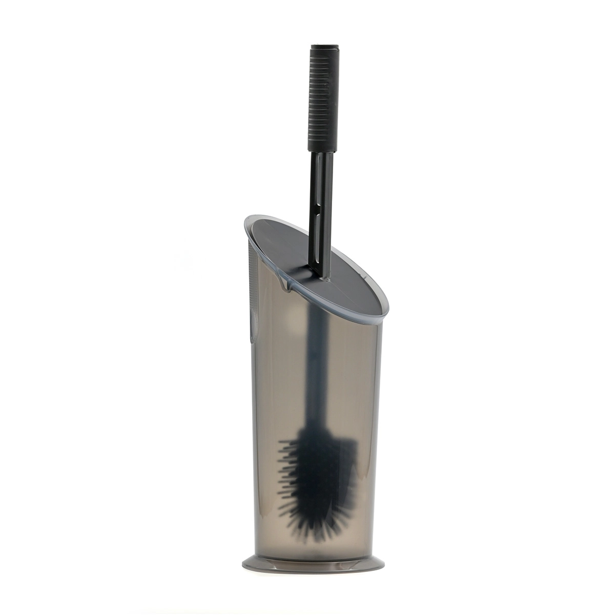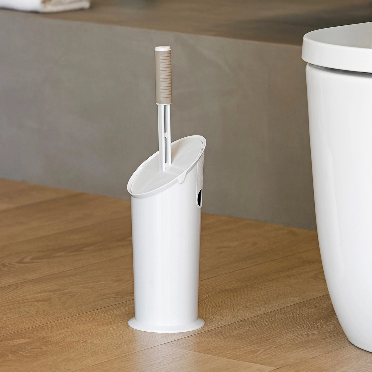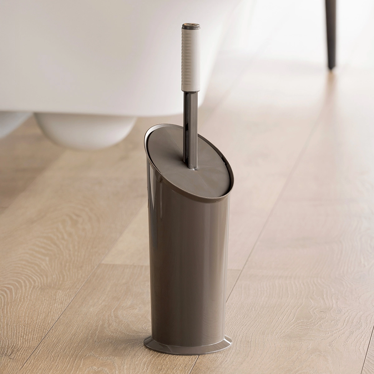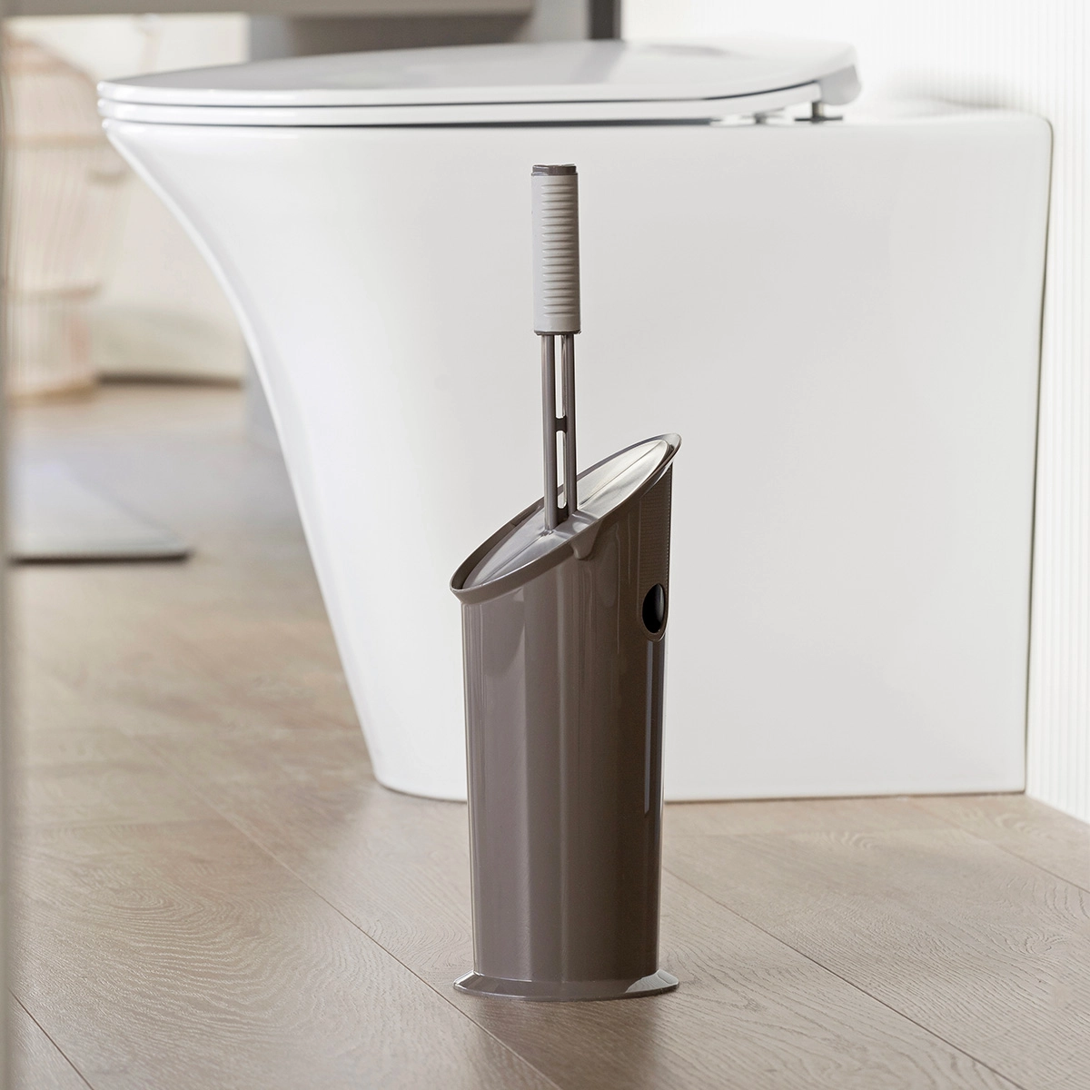 Innovativo porta scopino con impugnatura ergonomica e setole in gomma. Il suo design compatto e l’estetica funzionale assicurano un tocco raffinato in tutti i bagni.
