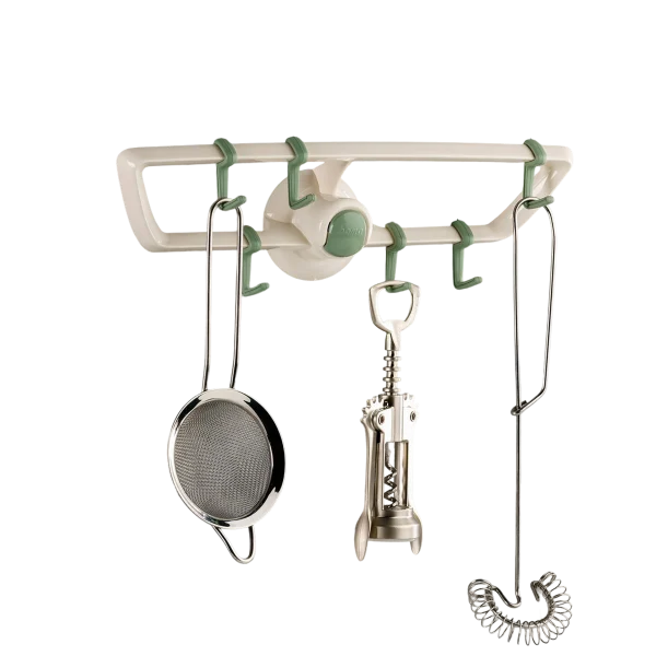 Portautensili per la cucina in plastica da fissare con la ventosa o le viti incluse. I ganci scorrevoli consentono di avere mestoli e altri utensili sempre a disposizione, oltre che in ordine.