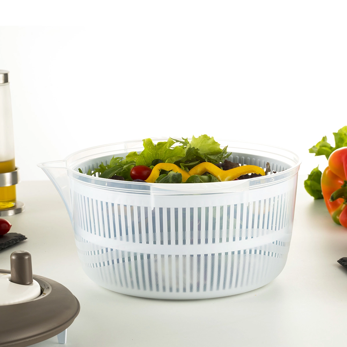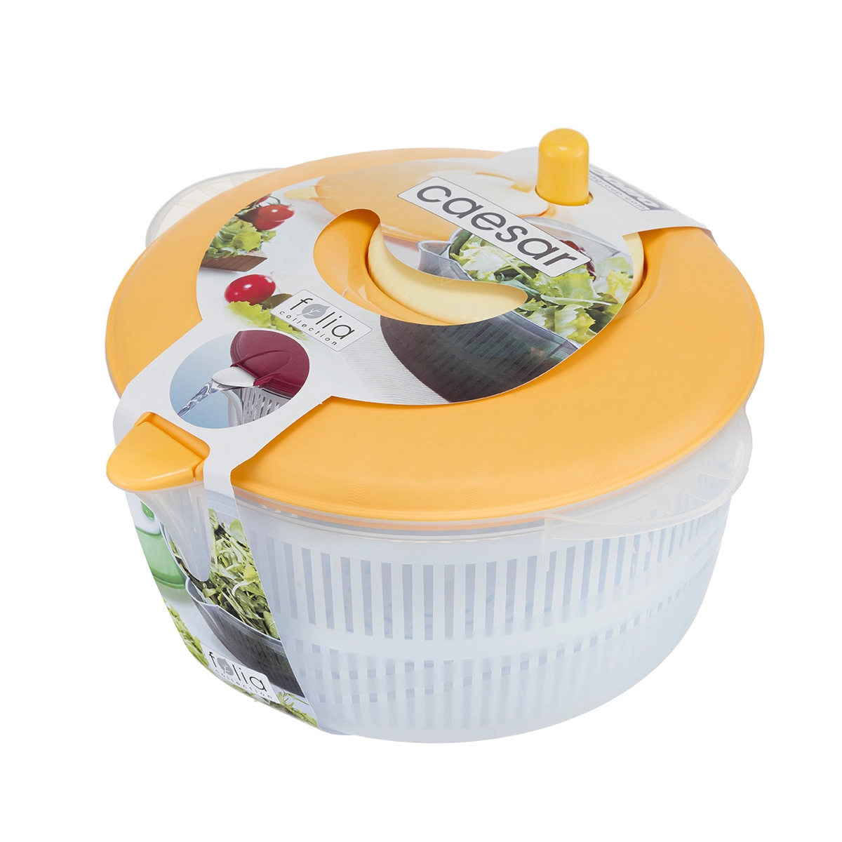Espositore in cartone formato midi per 16 centrifughe per insalata Folia Caesar progettato con l’obiettivo di catturare l’attenzione in ogni punto vendita.