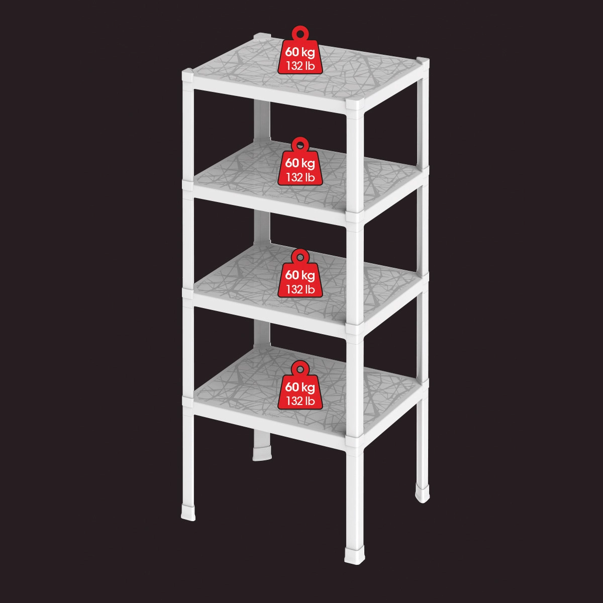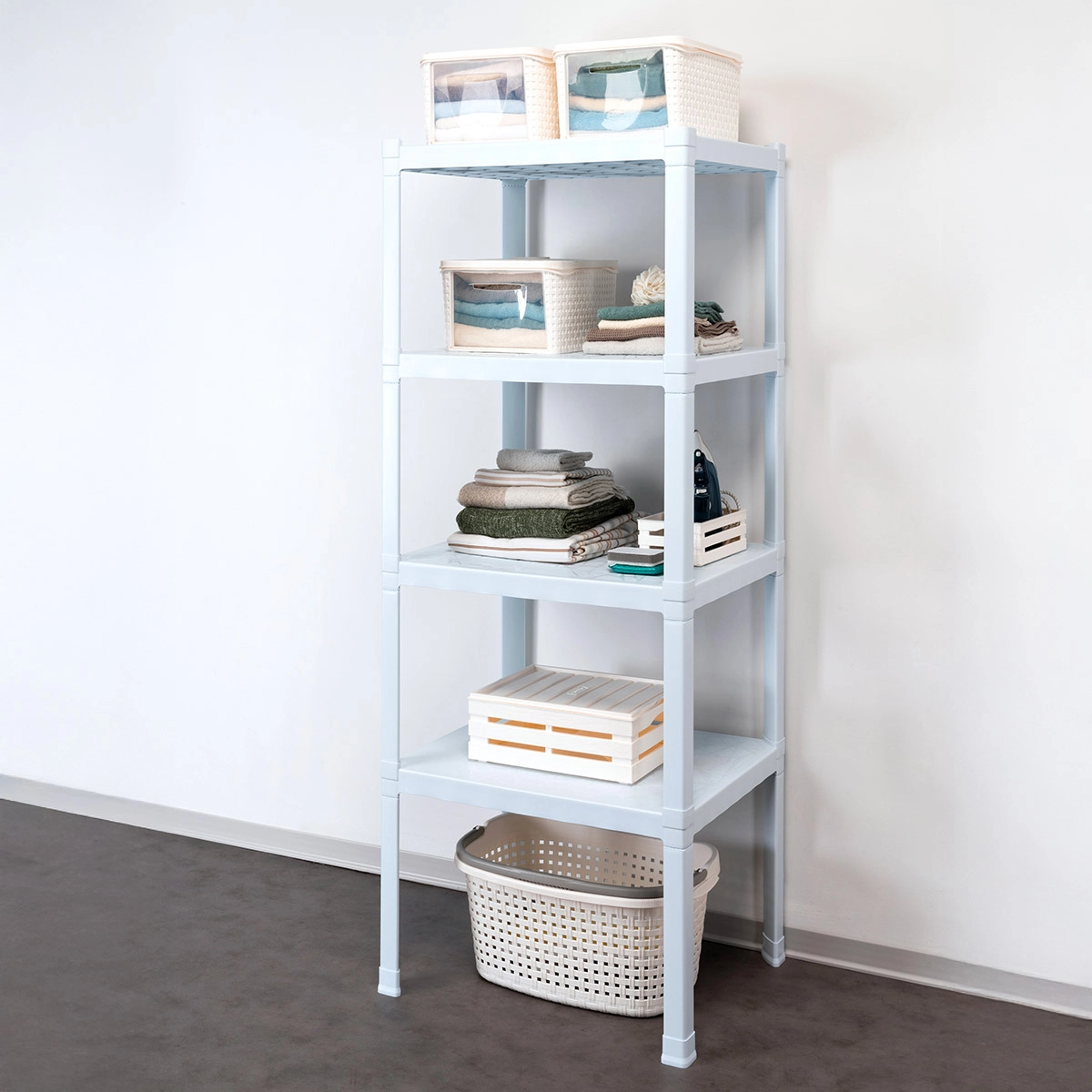 Scaffale in plastica componibile con 4 ripiani della portata di 60 kg l’uno. Resistente a urti, freddo e intemperie, è lavabile e facile da montare.