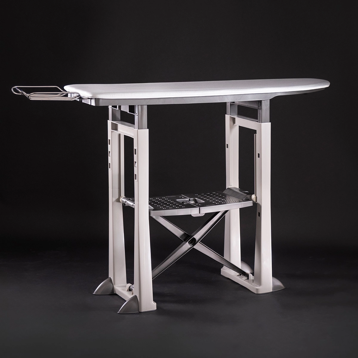 Tavolo da stiro regolabile in 3 posizioni con piano traspirante e mensola portatutto.