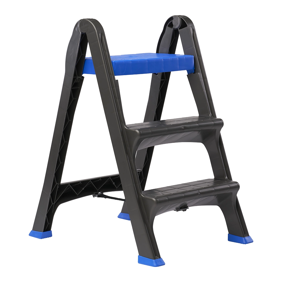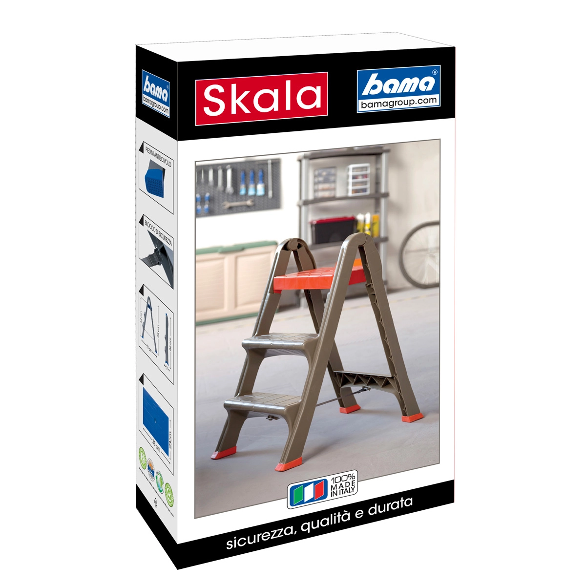 Scaletta a 3 gradini leggera e sicura, con piedini antiscivolo e blocco di sicurezza. Testata secondo la norma UNI EN 14183:2004.