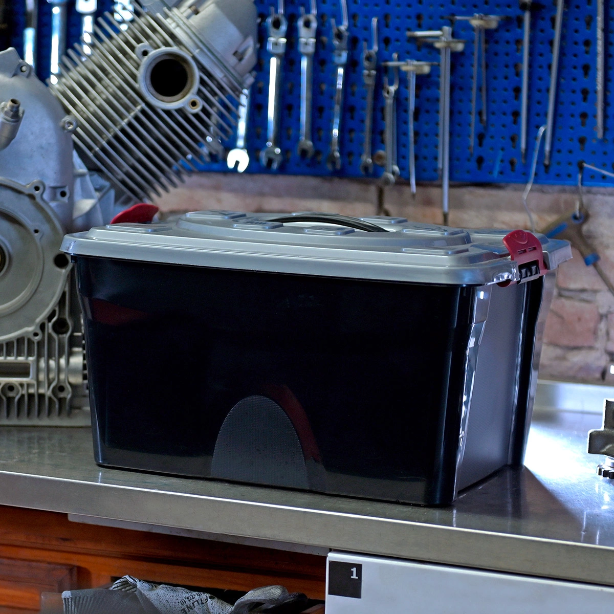 Il coperchio removibile può aprirsi a cerniera in base alle necessità. Il vano interno a scomparti separa gli utensili da lavoro e, una volta tolto, permette di accedere al contenitore sottostante più ampio.