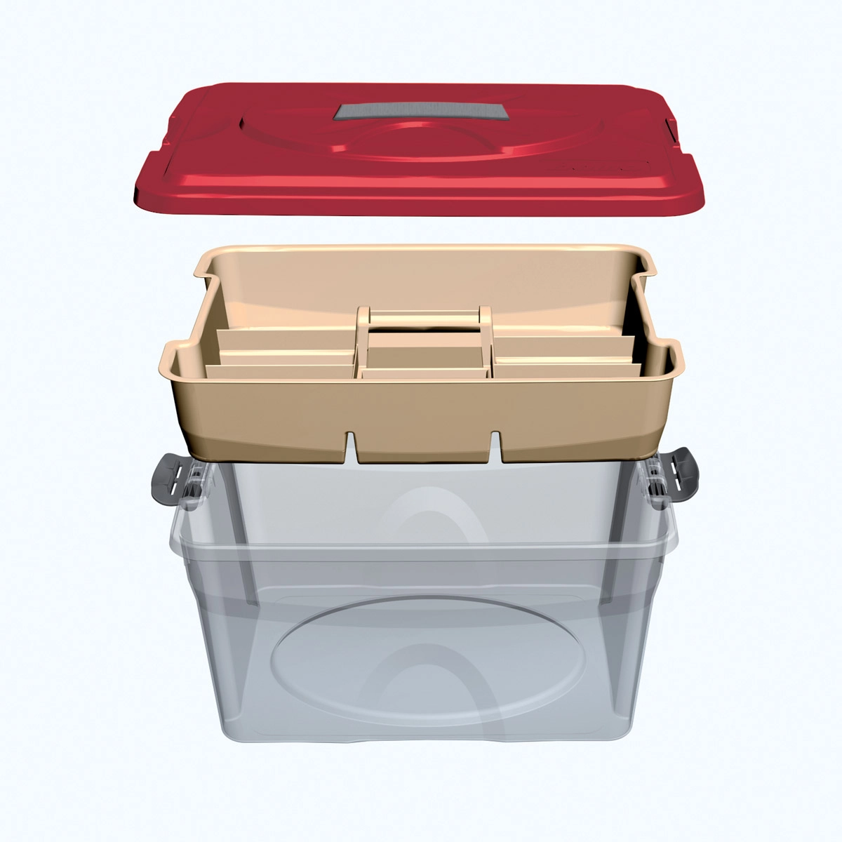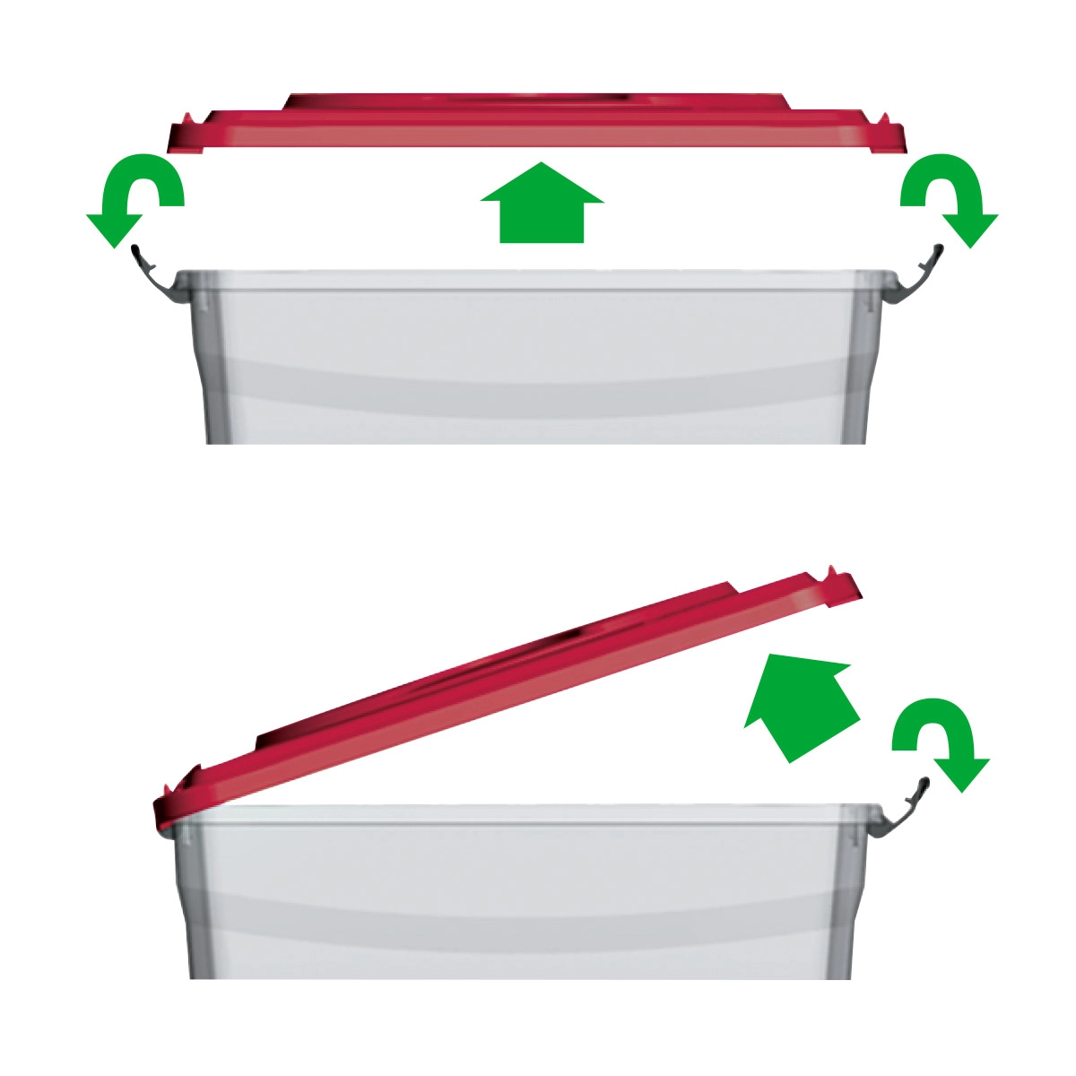 Contenitori in plastica sovrapponibili con apertura a cerniera e chiusura a scatto.
