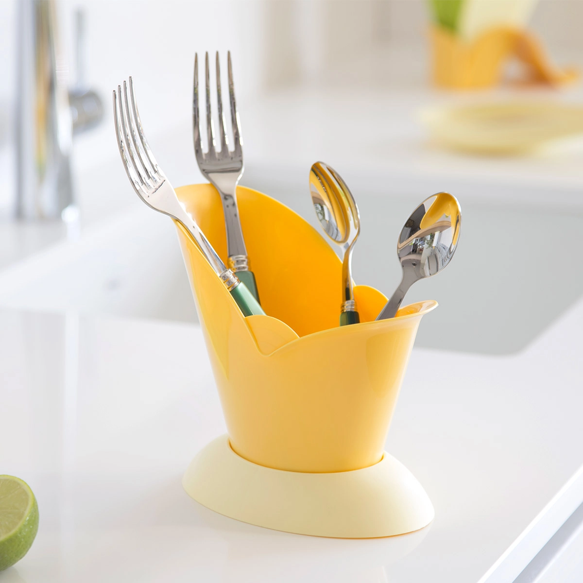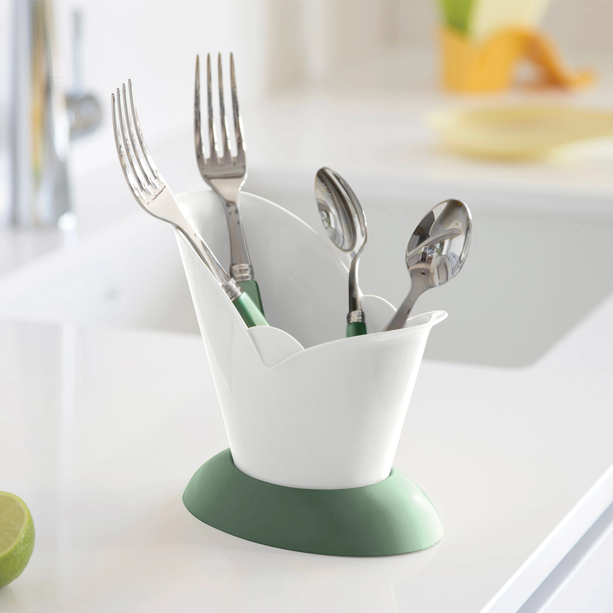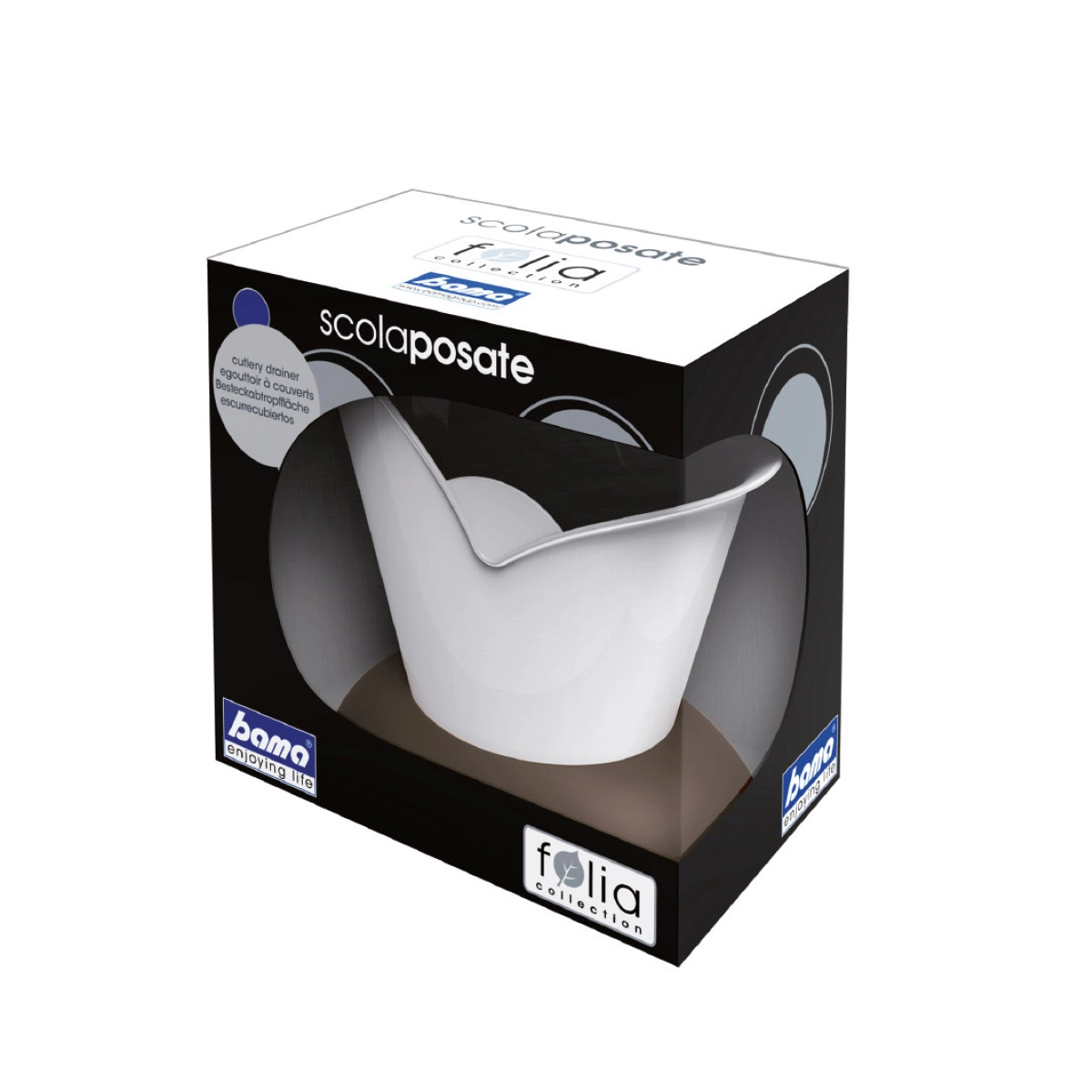 Scola posate in plastica con raccoglitore salvagoccia alla base: l’ideale per asciugare forchette, coltelli, cucchiai, cucchiaini e utensili senza bagnare la superficie d’appoggio.