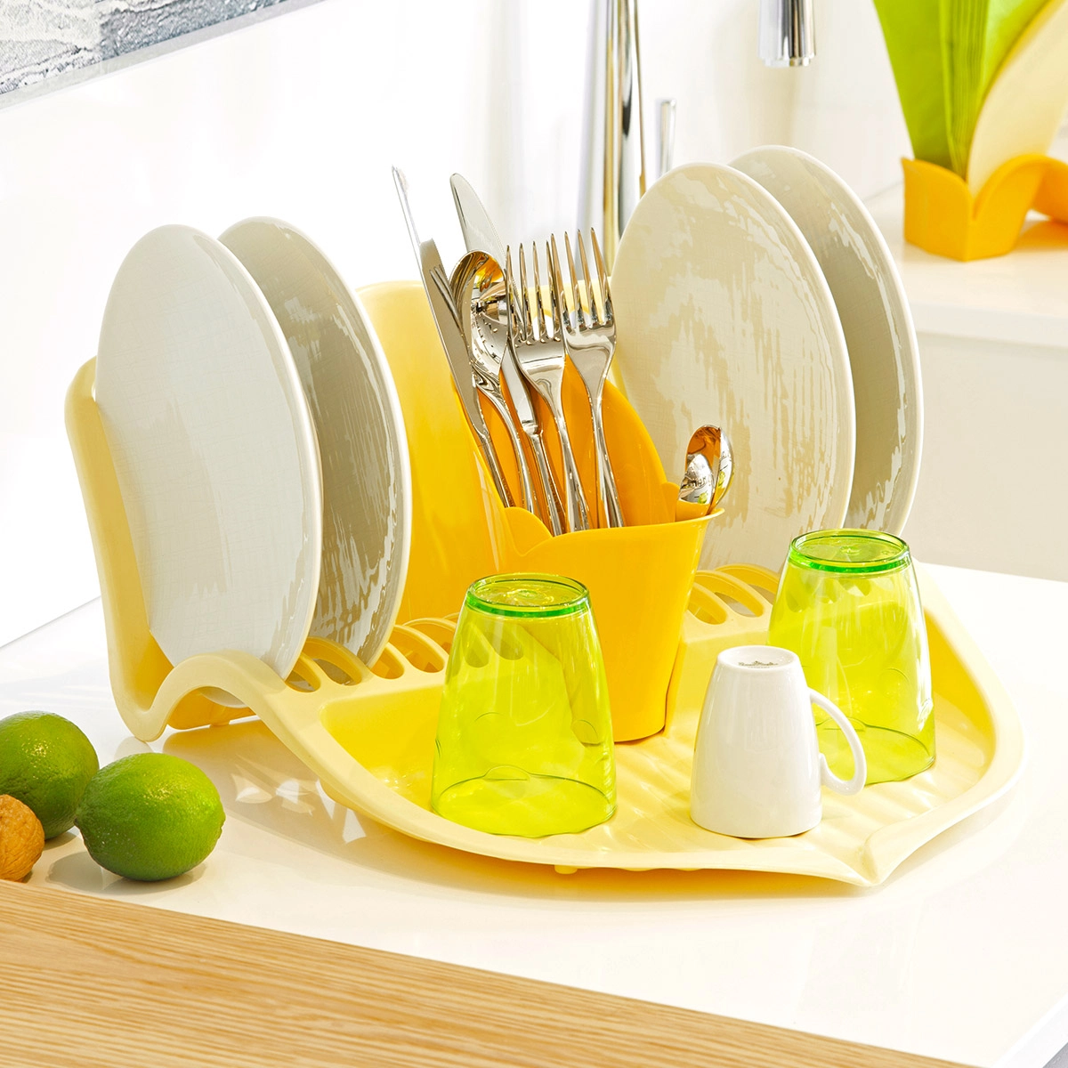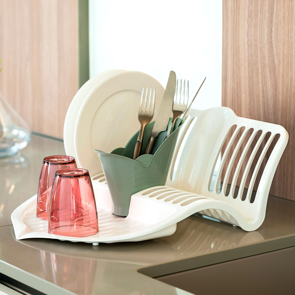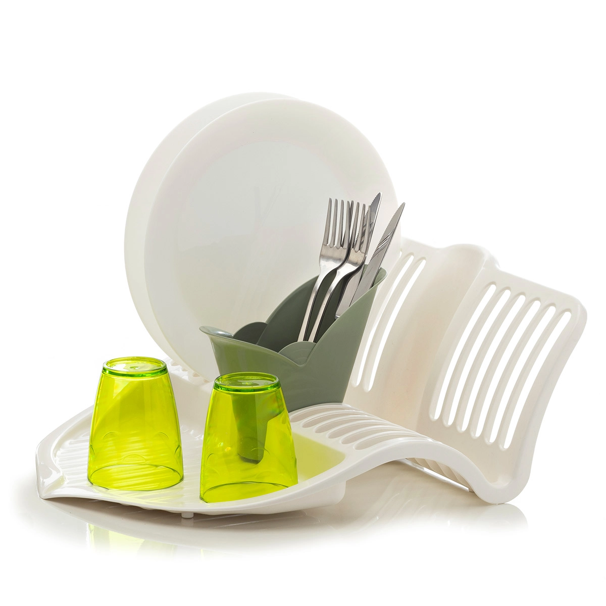 Scolapiatti in plastica tutto in uno perché completo di poggia bicchieri e comparto scolaposate. Un accessorio versatile e salvaspazio per una cucina ben organizzata.