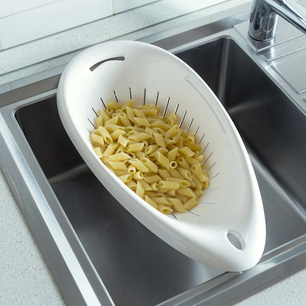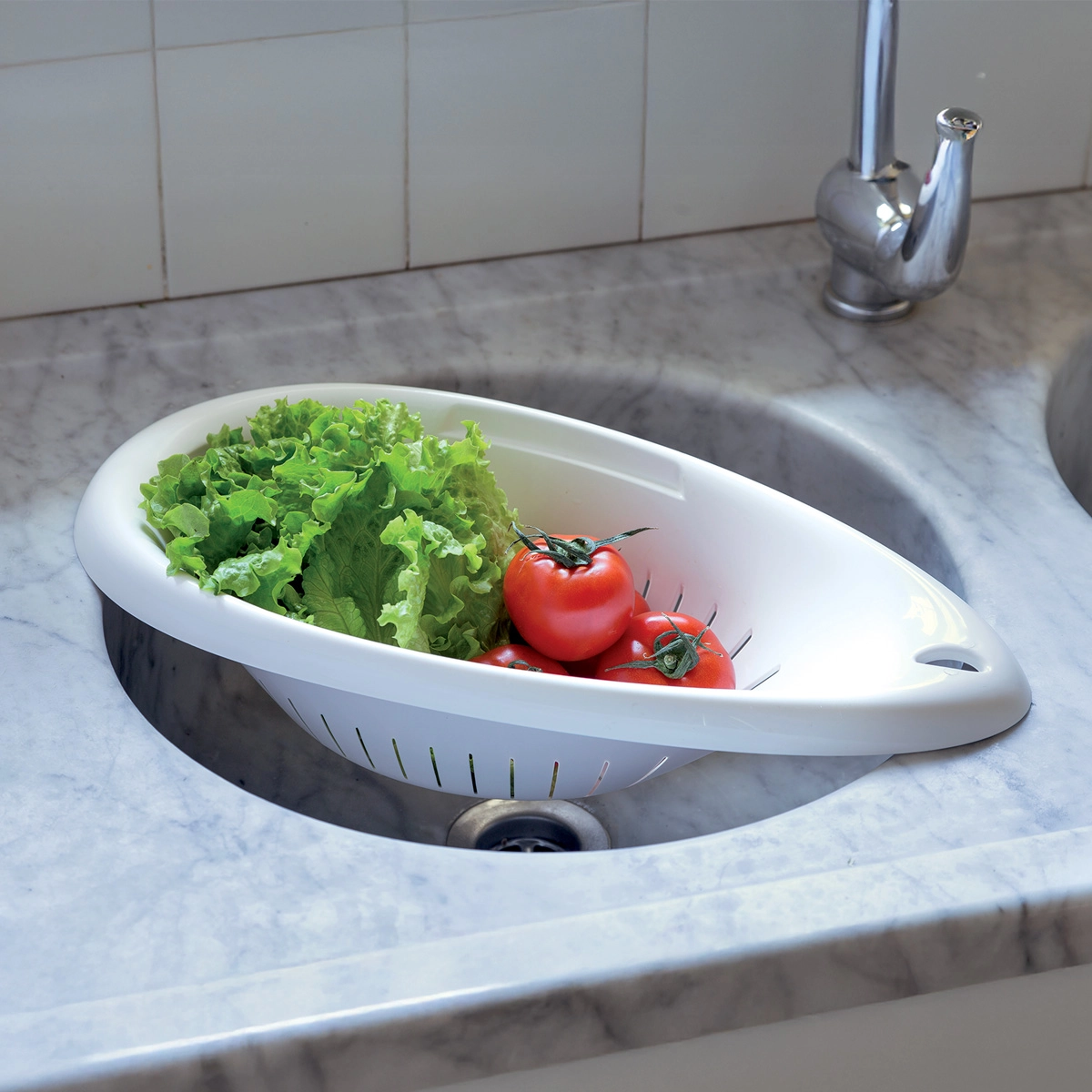 Scolatutto per lavello in plastica capace di adattarsi a ogni tipo di acquaio grazie alla forma ovale e ai bordi sporgenti. Un grande aiuto in cucina!