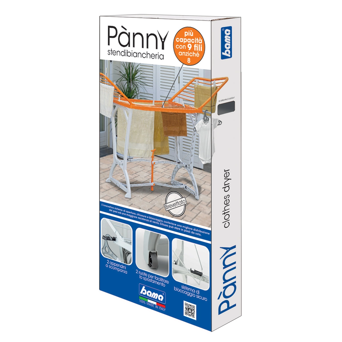 Oltre ai 9 fili per parte, dispone anche di 2 ruote e 2 supporti per gli appendiabiti. Chiuso sta in piedi da solo. Non arrugginisce, resiste ai raggi UV e alle intemperie. Abbinabile al pratico porta mollette acquistabile separatamente.