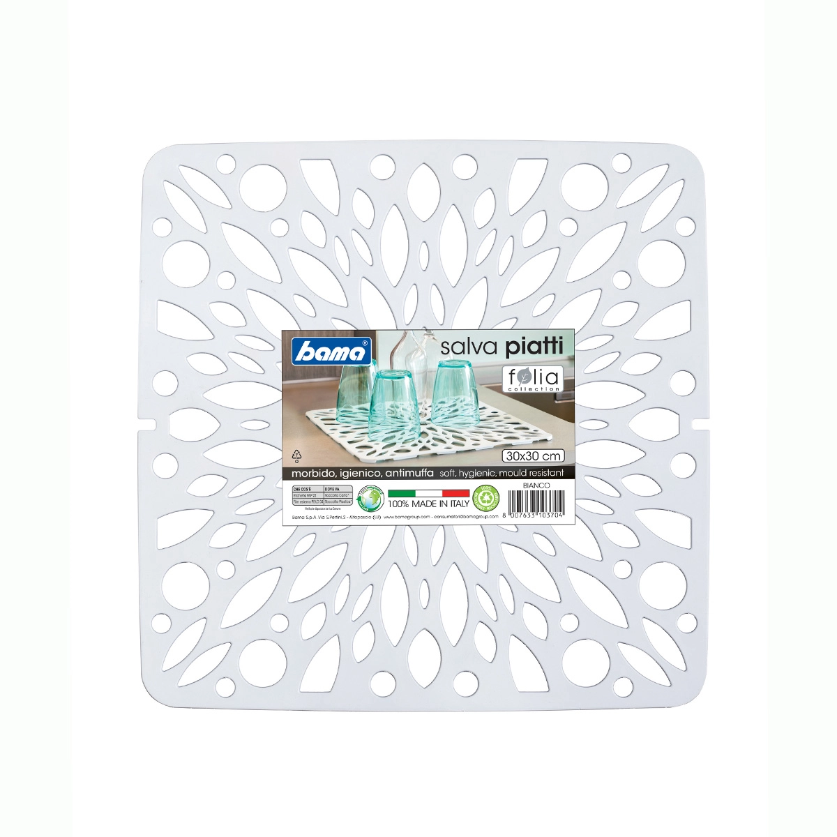 Tappetino per il lavello antiscivolo e antimuffa di forma quadrata (30 x 30 cm) con lavorazione traforata dal design simile alle foglie. Adatto per appoggiare piatti e bicchieri in sicurezza.